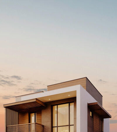 Architecturally, the mass composition plays with geometry and contrast. The facade showcases a bold, minimalist vocabulary — two strong rectangular volumes frame the structure on either side, rendered in white stucco-finished massing, softened with vertical timber cladding. Between these, a cantilevered central unit projects 7 feet outward, acting as a striking focal point and anchoring the visual symmetry of the elevation. This volume is articulated with vertical wooden fins, providing rhythm, depth, and solar shading.