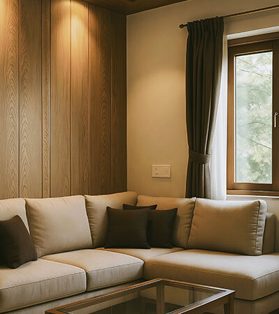 The residence spans 1,500 sq. ft., featuring a 3BHK layout with a central family lounge, intended for relaxed gatherings and slow-paced living. The planning emphasizes indoor-outdoor connection, with each bedroom opening to a private balcony, inviting natural light and panoramic views of the surrounding greenery.